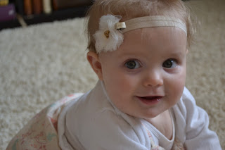 I don't know if Hadley is the best communicator, or just the sweetest little girl ever, but either way she is very easy to soothe and help if she is ever sad. Usually she is just ready for a nap and that is about it. She is super flexible with our every changing schedule and often doesn't go down for a morning nap until 11:00. She is so fun to take places and I love having her as my shopping buddy whenever I can take her, even if it means she stays up way past her bedtime. She loves getting out and last week at the indoor swimming pool she was in heaven with the whole new experience. Everyone at the gym always talks about how Hadley is the most easy going baby. Hadley is learning to give kisses and doesn't know any signs, but has her own sign of sorts for "more". She just waves her arms frantically until she gets more of whatever she is eating. She also sings at times. She started singing a lot at church, but it has kind of died down in the last few weeks. Sometimes she will get super conversational and just talk and talk like everyone knows what she is saying.
